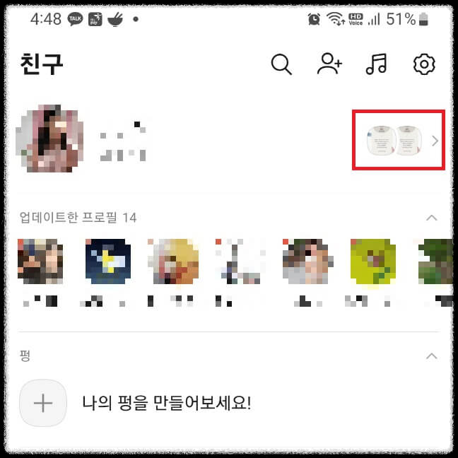 카카오톡 홈 화면 오른쪽 상단에 새로운 프로필이 생긴 것을 확인할 수 있습니다. 클릭해서 들어갑니다.